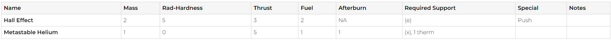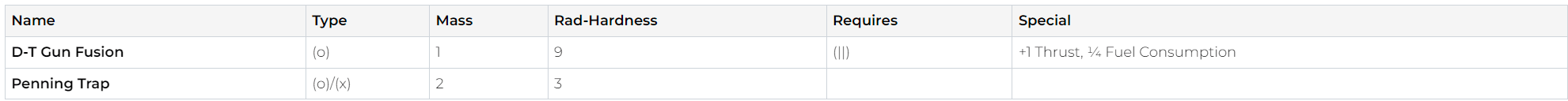 Okay, so this isn't actually the best combination of components. The DeLaval nozzle is pretty good, except that it needs a (o) reactor. The Project Orion reactor is an (o), but it also weighs 6 mass, so it'll greatly increase my effective fuel consumption. It also needs to discharge therms, but either of the two radiators would work for that pretty easily.