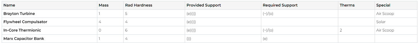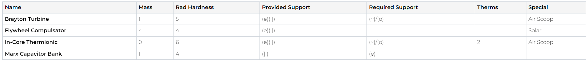 The Brayton Turbine and In-Core Thermionic Generators both require a (~)/(o) support. Luckily, a (||) support is able to provide and receive support for the same component, so either works. The In-Core Thermionic produces 2 Therms, though, which would require a larger radiator which invalidates the mass savings of using it over the Brayton Turbine. The Flywheel Compulsator is also large, and is solar so it'll reduce my thrust in the Ceres zone, so it's also ruled out. The Marx Capacitor Bank requires an (e) support, which is a bit less than ideal but I can manage.