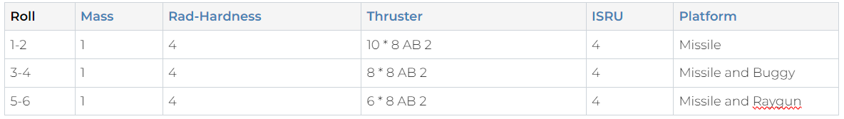 I also roll 1d6 for a secondary platform, -1 for having a raygun :1d6 - 1 = 3 - 1 = 2 – Beamed Power Platform. I can use the raygun on the module to beam 4kW of power to a receiver somewhere.